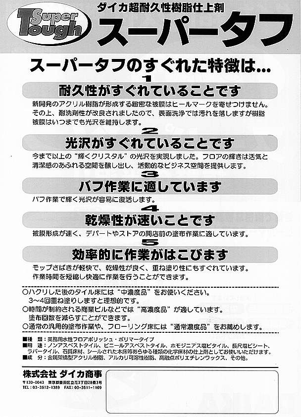 スーパータフ(高光沢ワックス) 床用ワックススーパータフ 18L 2019.03.222023.10.17 スーパータフ 18L スーパータフ(高光沢ワックス) 光沢を重視した厚塗り感のあるワックス 通常の床ワックスよりも光沢を重視した高級タイプの床ワックス。通常濃度・中濃度・高濃度と三種類の濃度から使い分けが可能。皮膜に硬質感があり耐水性にも優れる。 容量:18L標準塗布面積:原液・1回塗布 通常濃度 1,500㎡/1缶 中濃度 1,400㎡/1缶 高濃度 1,300㎡/1缶 スーパータフ リーフレット(表) スーパータフ リーフレット(裏)
